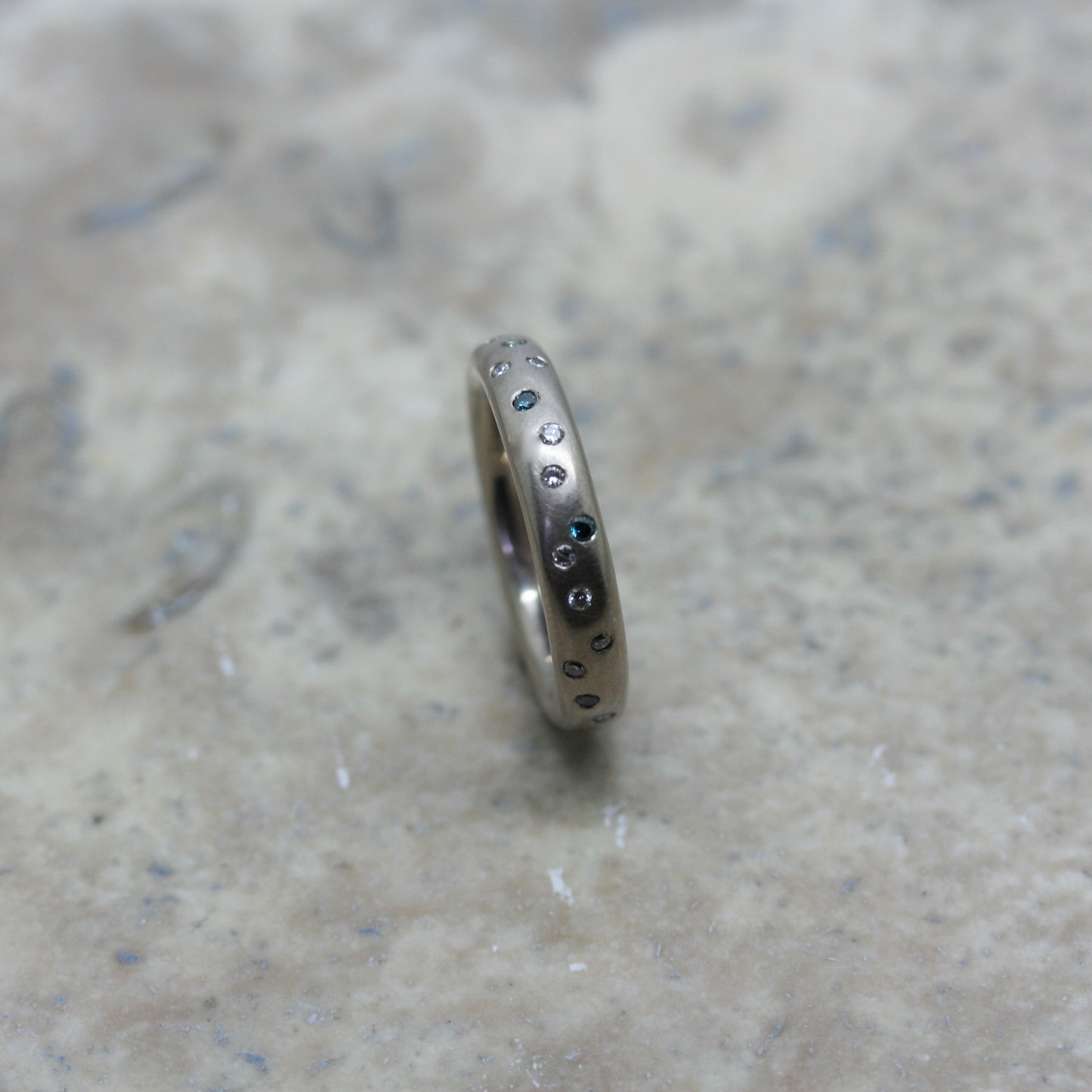 Blue and white Diamonds set randomly on this substantial 18ct white gold band