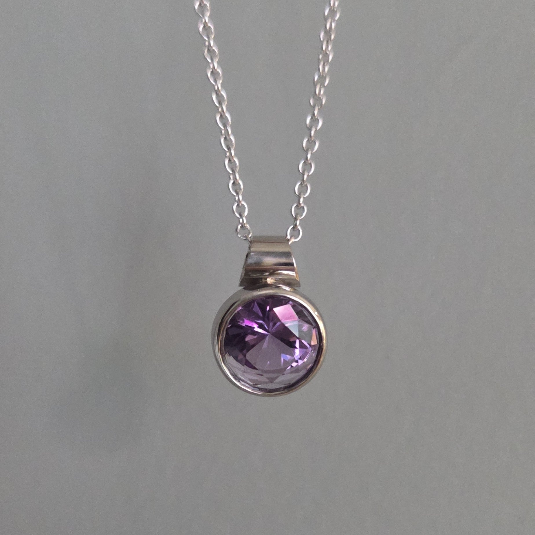 Brilliant cut Amethyst rub over set in an 18ct white Gold Pendant on a 14ct white gold trace chain