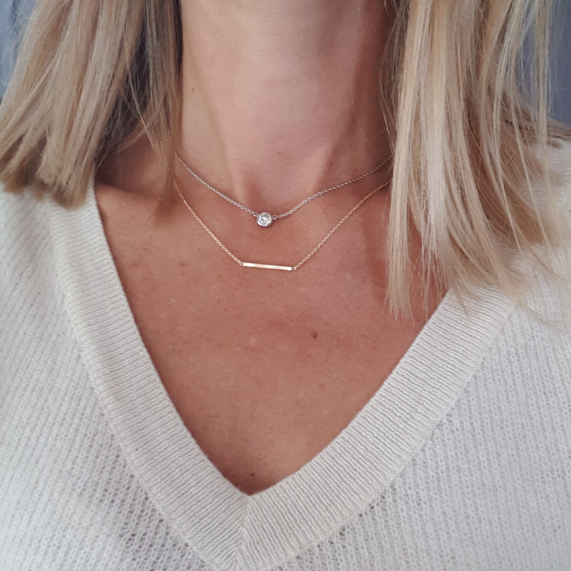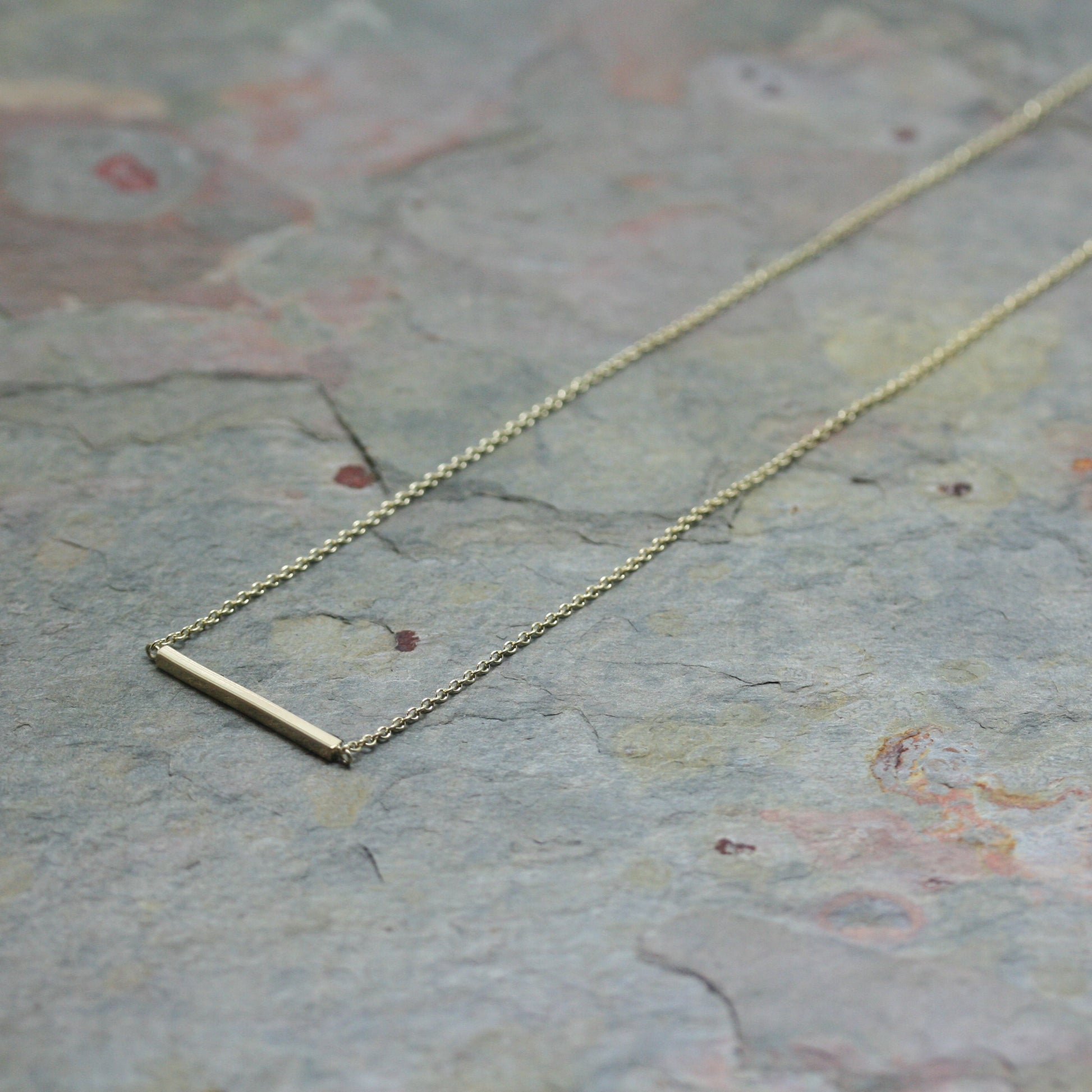 A simple 2cm 9ct yellow gold bar suspended between a fine chain
