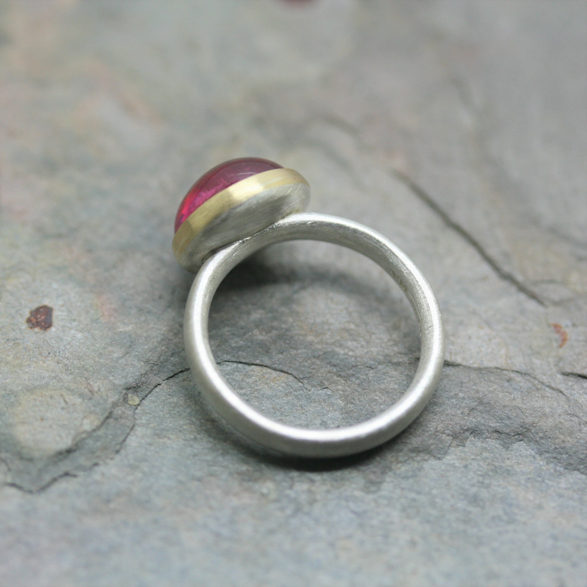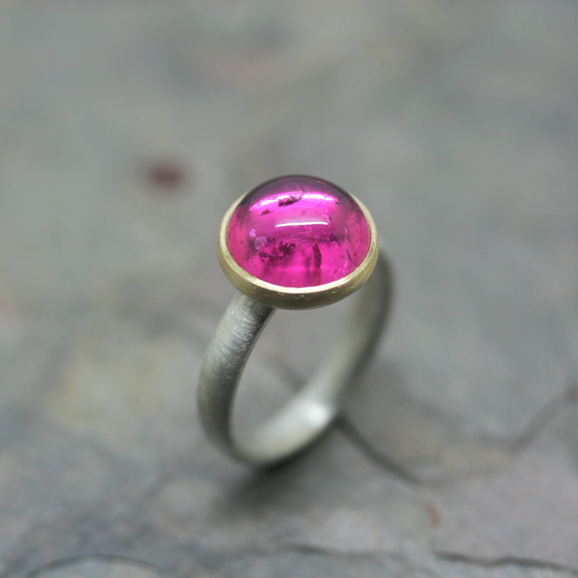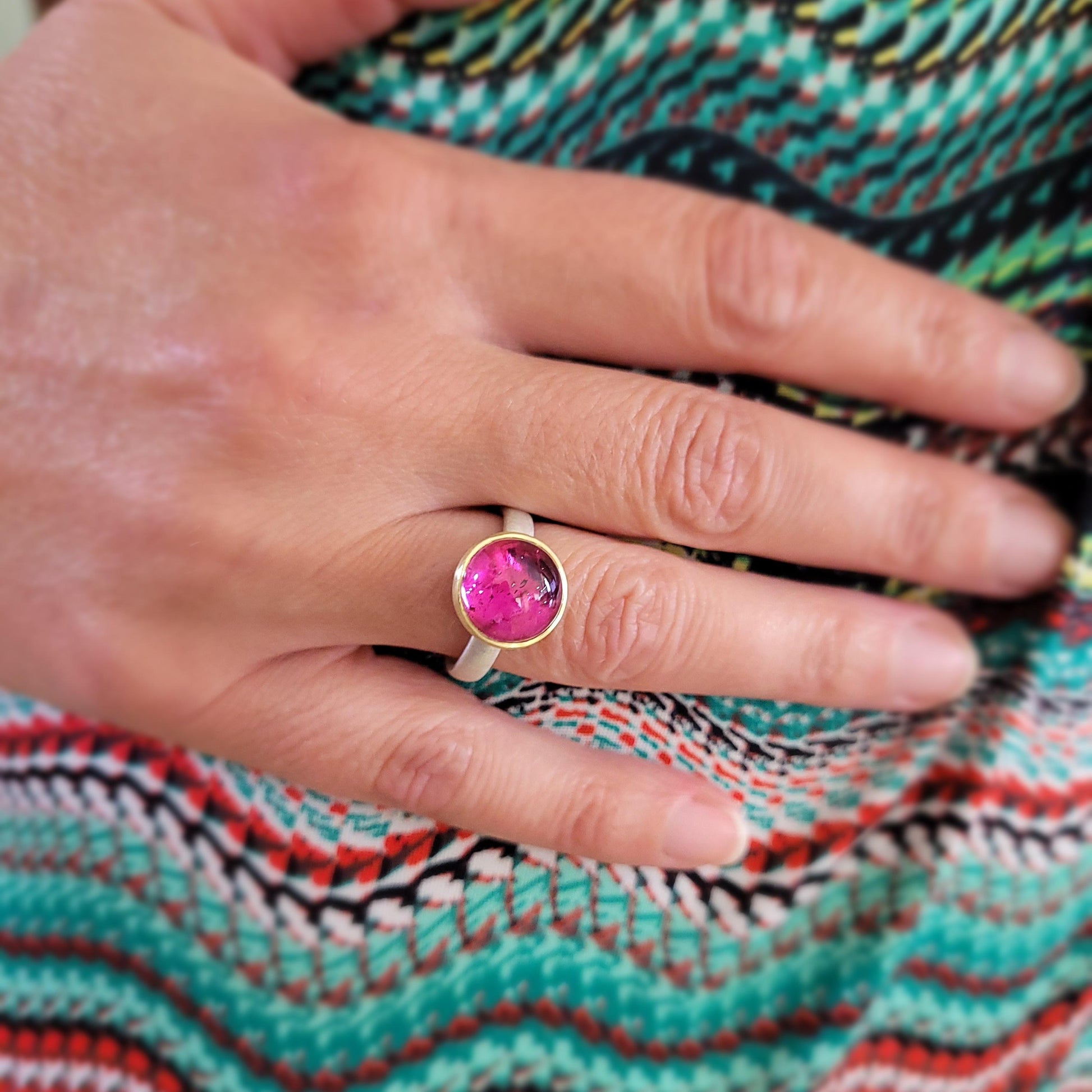 Set with a round cabochon intense pink Tourmaline approx 11mm