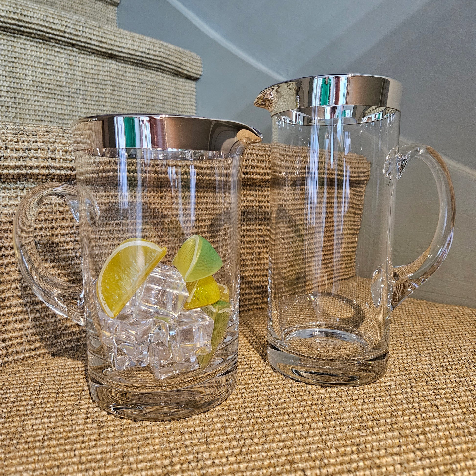These glass jugs have a hand applied electroplated heavy layer of pure silver around the top. They shout wedding or anniversary present to us!