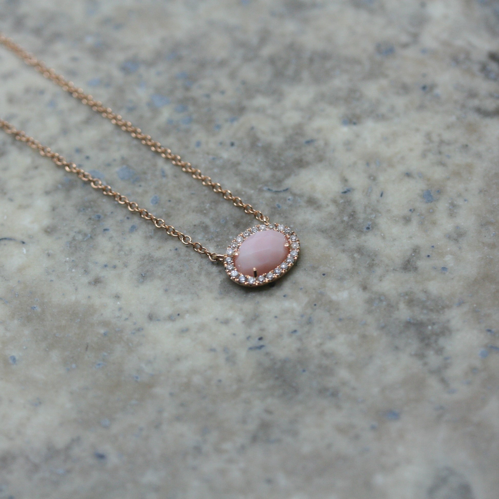 The perfect layering or stand alone necklace with a peach Opal surrounded by Diamonds