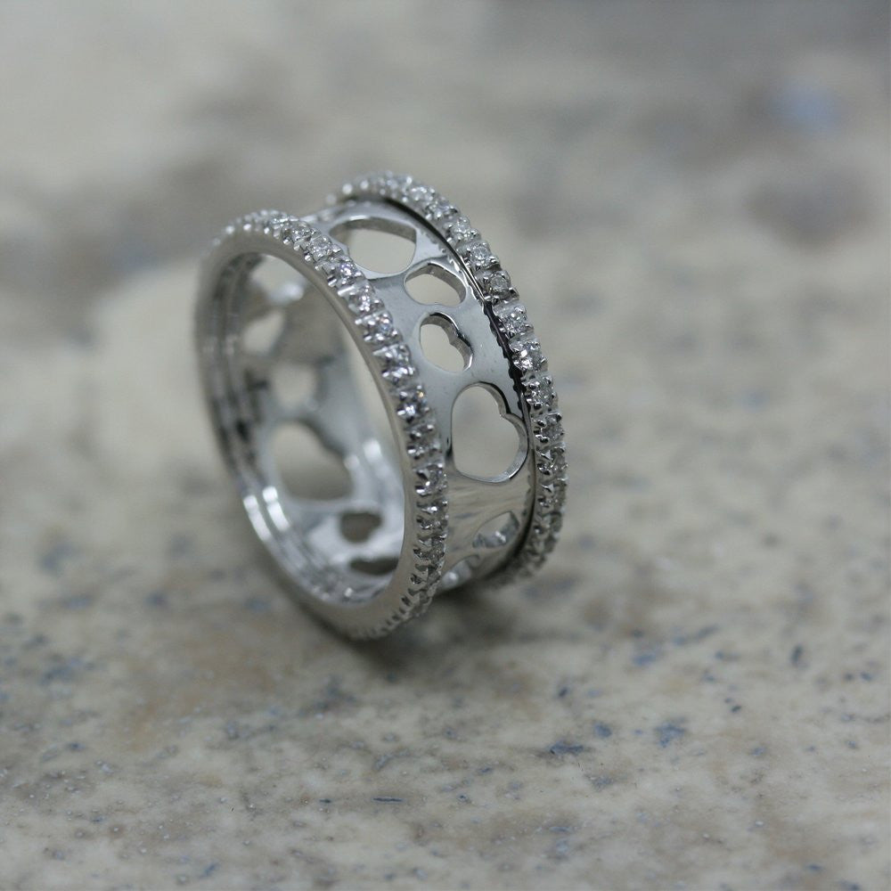 18ct white gold and diamond band ring with heart shapes cut out in a filigree style