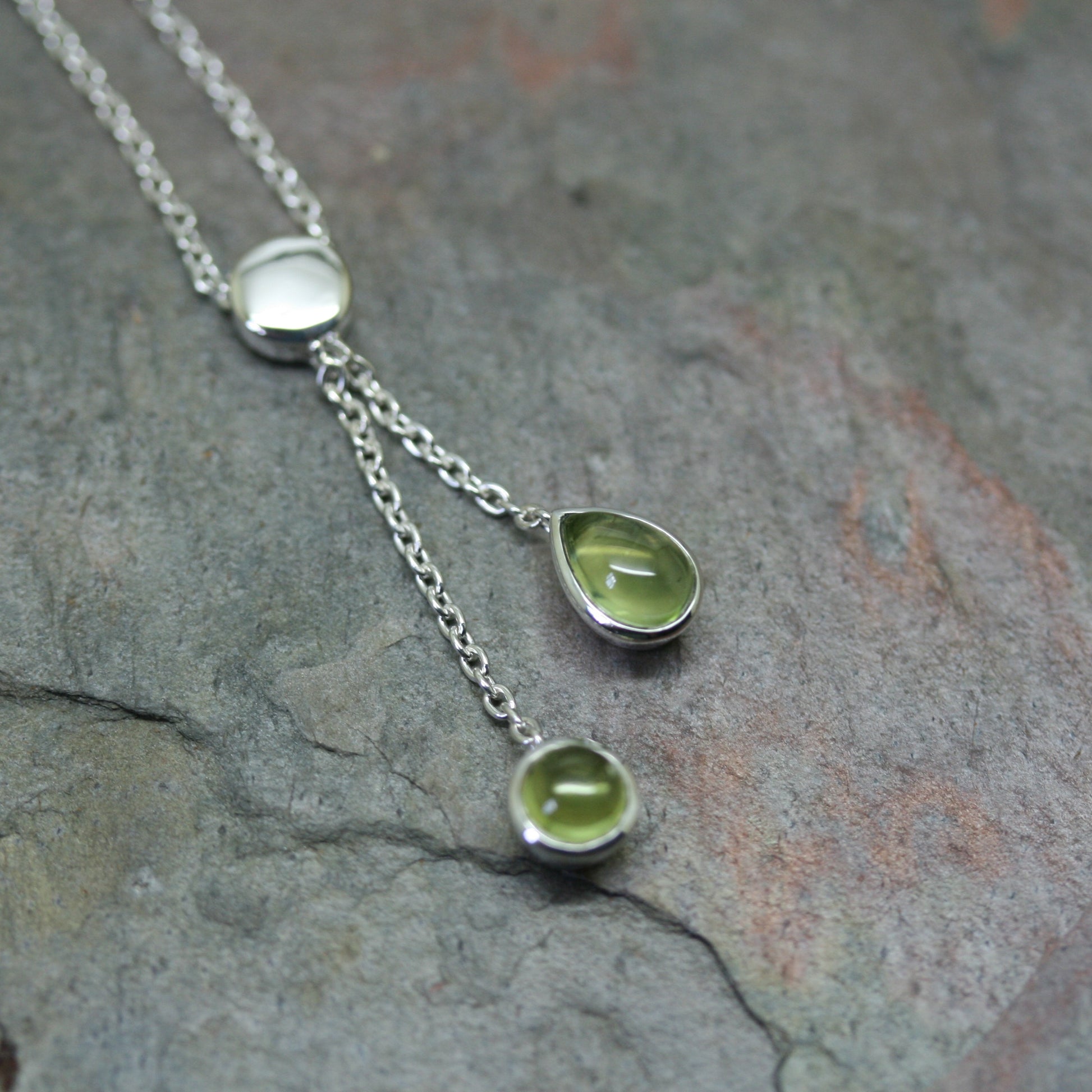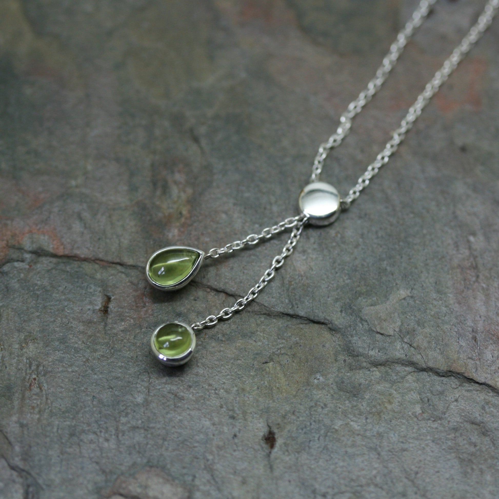Perfect layering piece with one round cabachon Peridot and one pearshape cabachon Peridot hanging from a silver disc