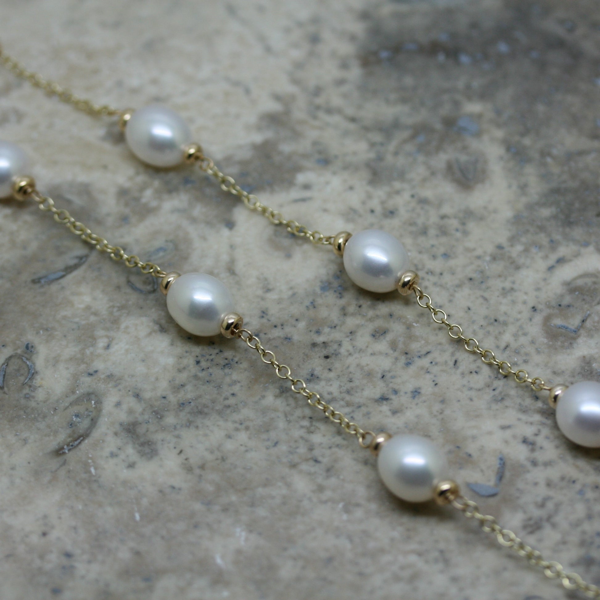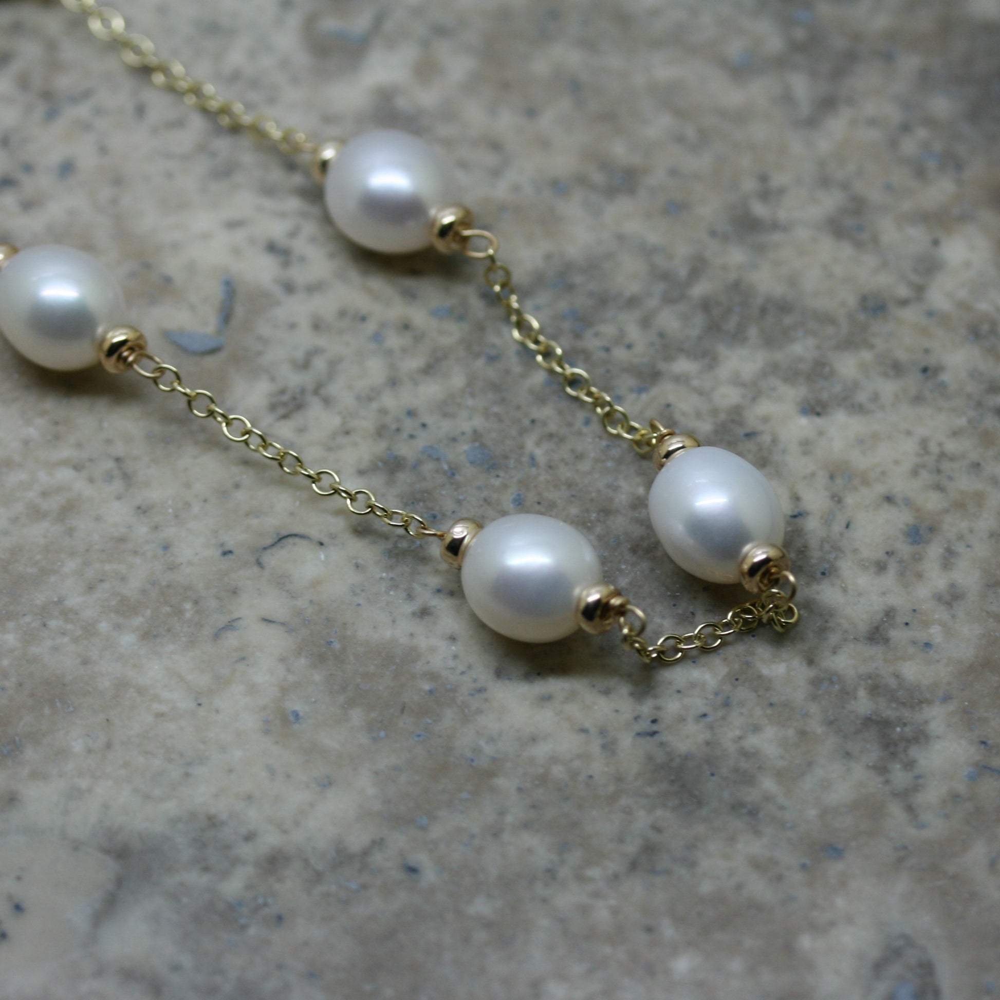 Modern Pearl necklace consisting of 9ct yellow gold chain with nine evenly spaced fixed oval Pearls