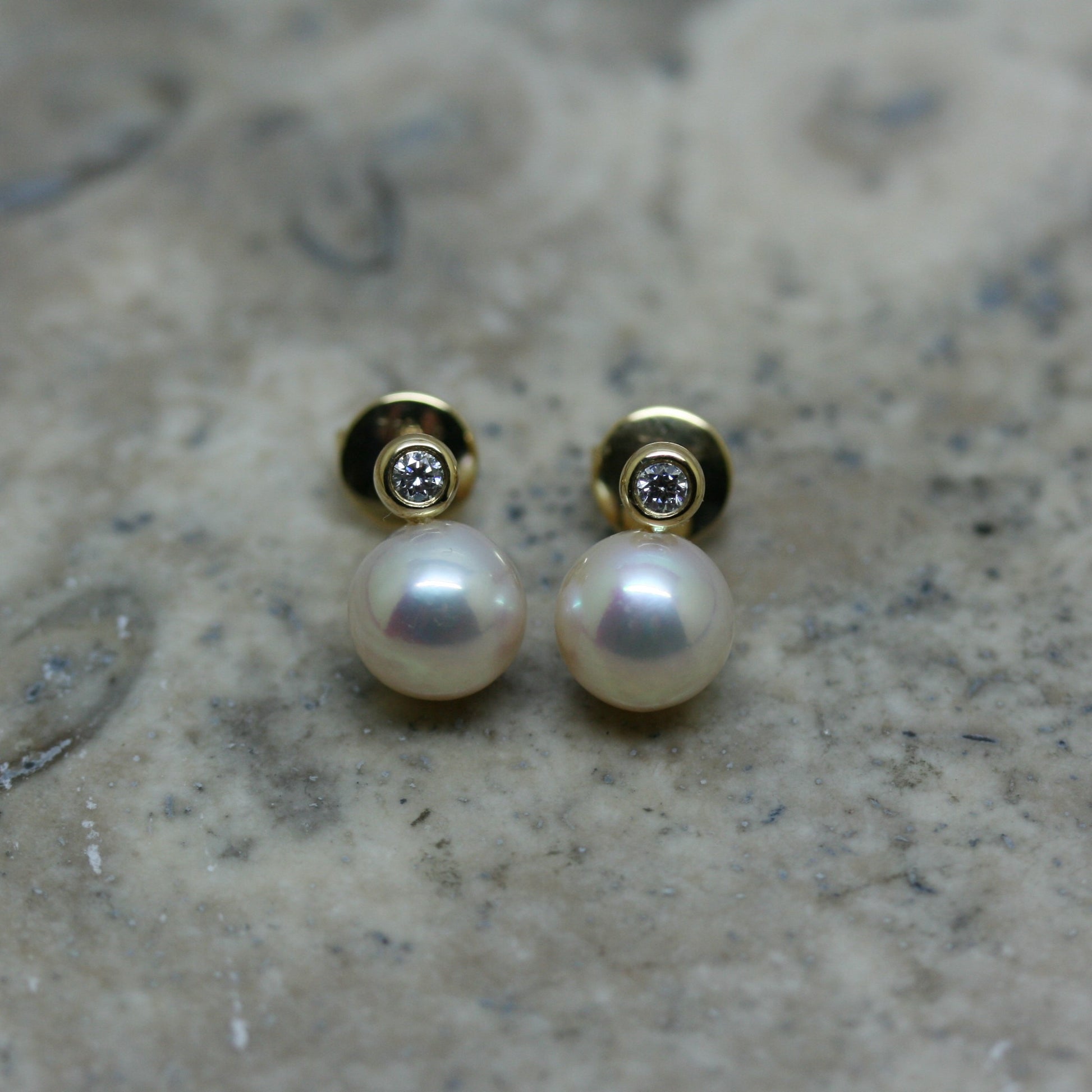 18ct Yellow gold post and butterfly fitting with 7.5mm pink freshwater Pearls with rubover set brilliant cut Diamonds approx. 0.10cts total weight