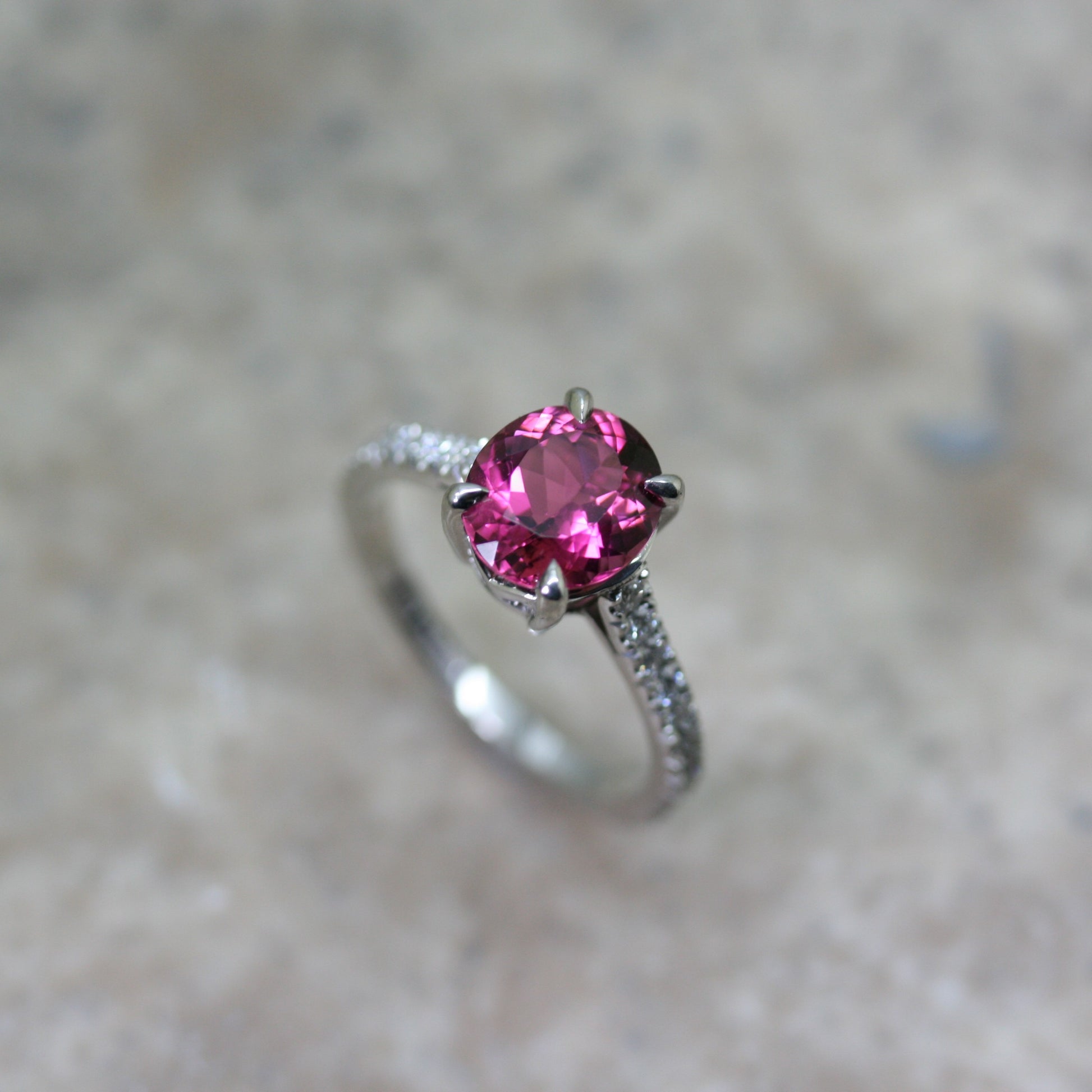 Pretty pink Rubellite Tourmaline set with 4 talon claws with Diamond set shoulders